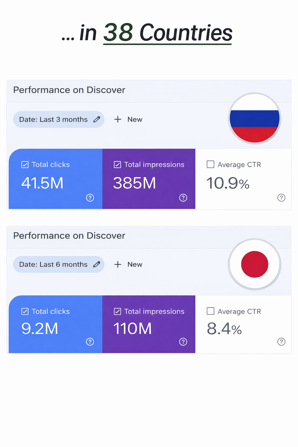 While other manuals might compile publicly available information, our guide is the result of over 15 years of attempts, failures, and constant testing. We’ve successfully used this exact strategy to get 15 of our own websites on Google Discover, consistently.